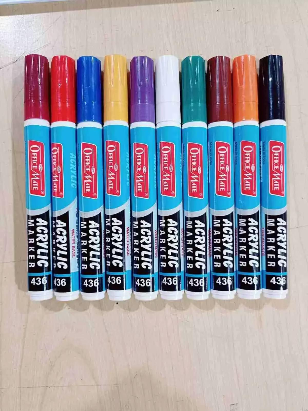 We have a large selection of acrylic paint markers. They frequently come in packs of eight, twelve, or even twenty-four colours. Primary tones (black, white, red, blue, yellow, and green) are followed by secondary and tertiary hues (orange, purple, pink, light blue, lime, etc.). Additionally, some sets feature metallic hues like silver and gold. Every colour is vivid and opaque. You can even layer them because they're acrylic; after one colour dries, you can draw over it with another. Your projects can be very creative with this colour scheme.