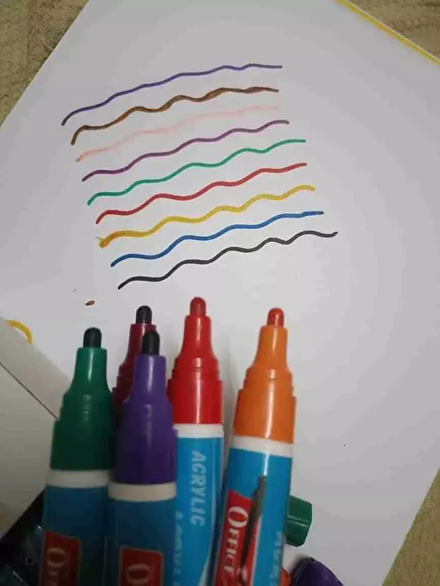 The acrylic markers will appear on dark or black surfaces because they are opaque. The interior paint is highly pigmented. Drawing with a white or yellow acrylic marker, for instance, on a dark rock or a black poster board will produce a solid and noticeable colour (some light colours may require a second pass for full brightness, but they are meant to cover). Because of this, they work well on projects with dark paper, dark textiles, or any other coloured background because the colours will stand out and not be overshadowed.