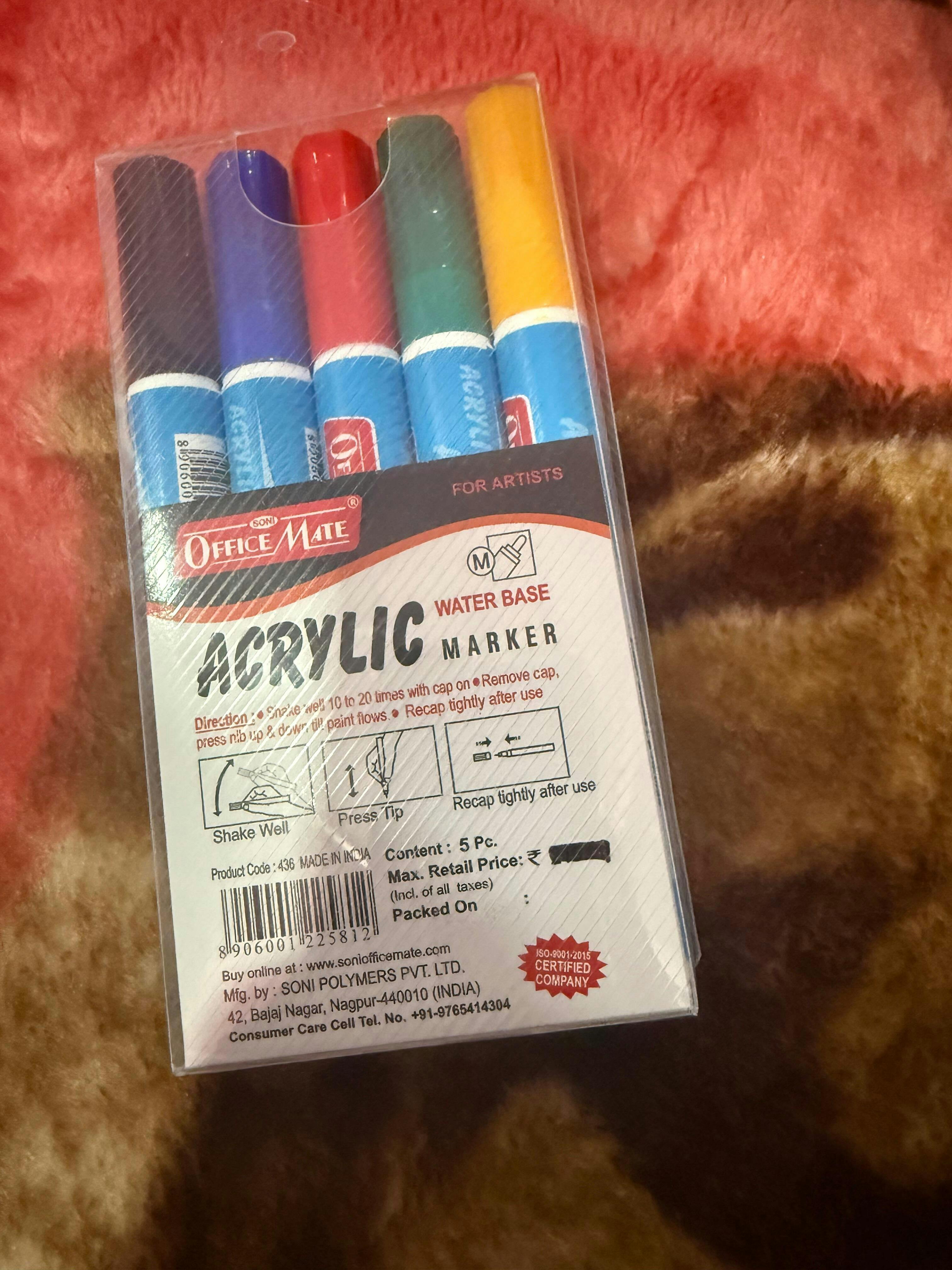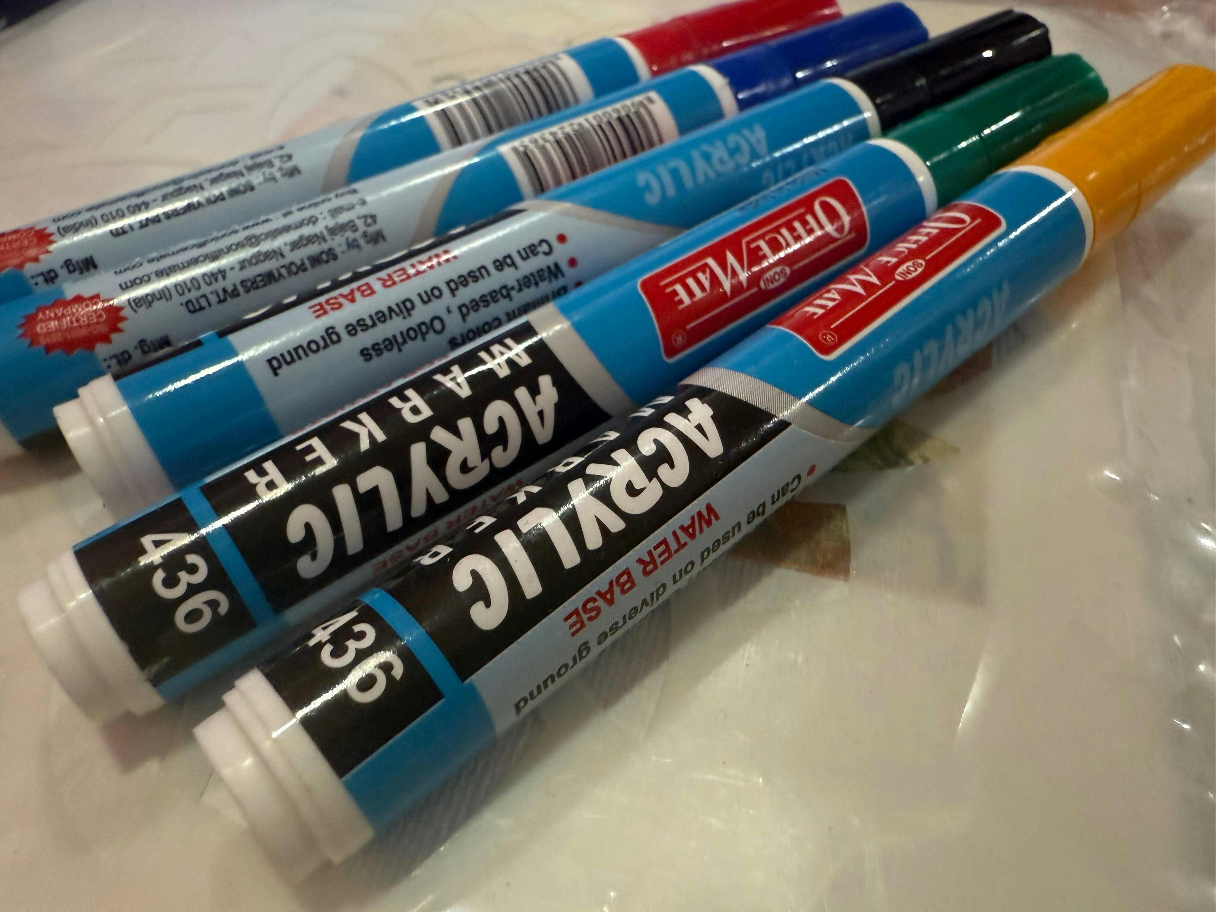 We have a large selection of acrylic paint markers. They frequently come in packs of eight, twelve, or even twenty-four colours. Primary tones (black, white, red, blue, yellow, and green) are followed by secondary and tertiary hues (orange, purple, pink, light blue, lime, etc.). Additionally, some sets feature metallic hues like silver and gold. Every colour is vivid and opaque. You can even layer them because they're acrylic; after one colour dries, you can draw over it with another. Your projects can be very creative with this colour scheme.