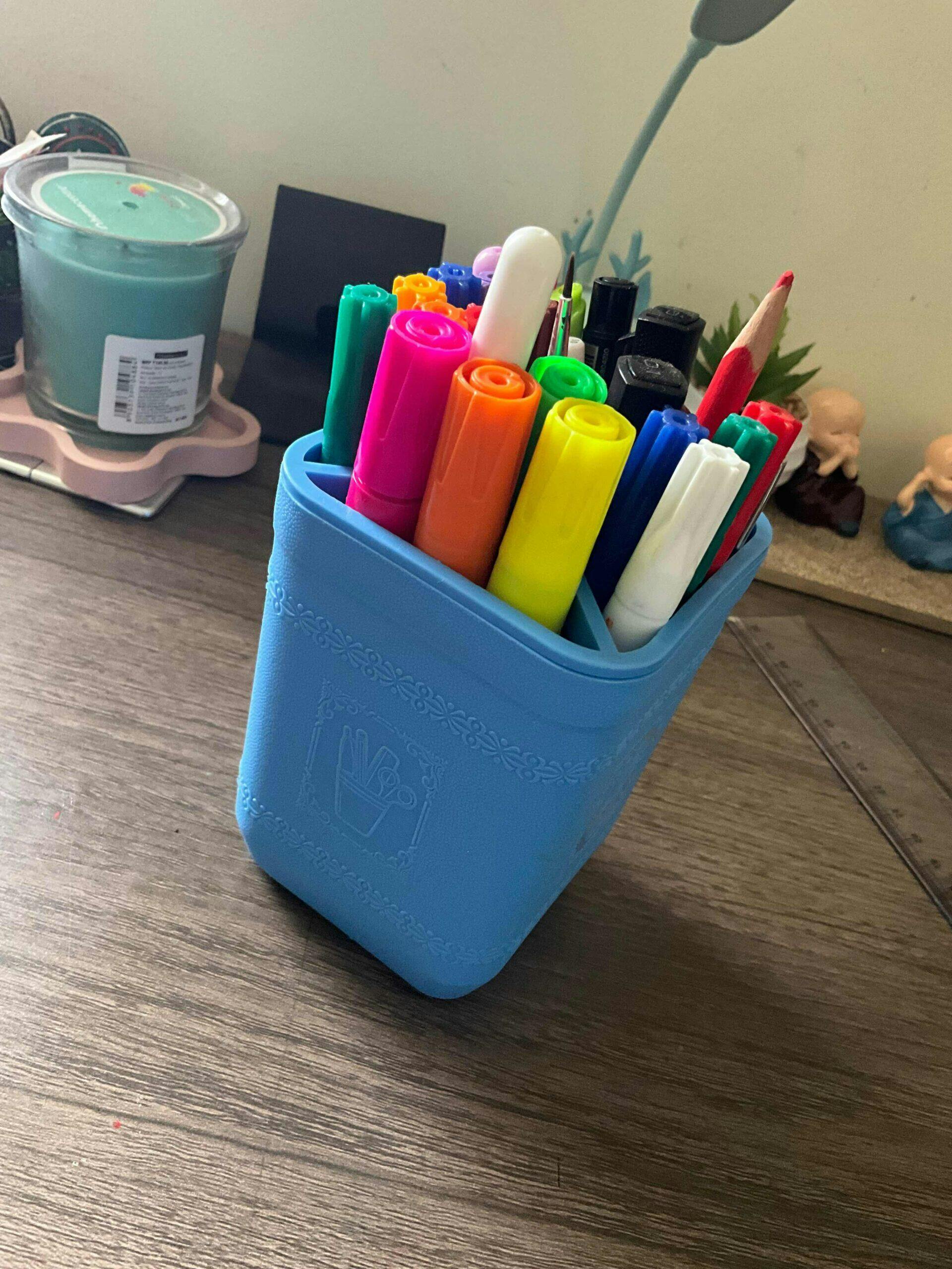 Yes, the pen stand has a little more functionality than just being a cup. It has two shallow compartments built into the upper rim. You can store things like push pins, paper clips, and erasers in these tiny trays or "attachable heads." They resemble handy dishes on top for small items you want easy access to, rather than deep pockets that reach all the way to the bottom of the stand. Your pencils and pens are kept in the main body. In this manner, it assists in keeping your writing implements and those small desk accessories that are otherwise disorganised.