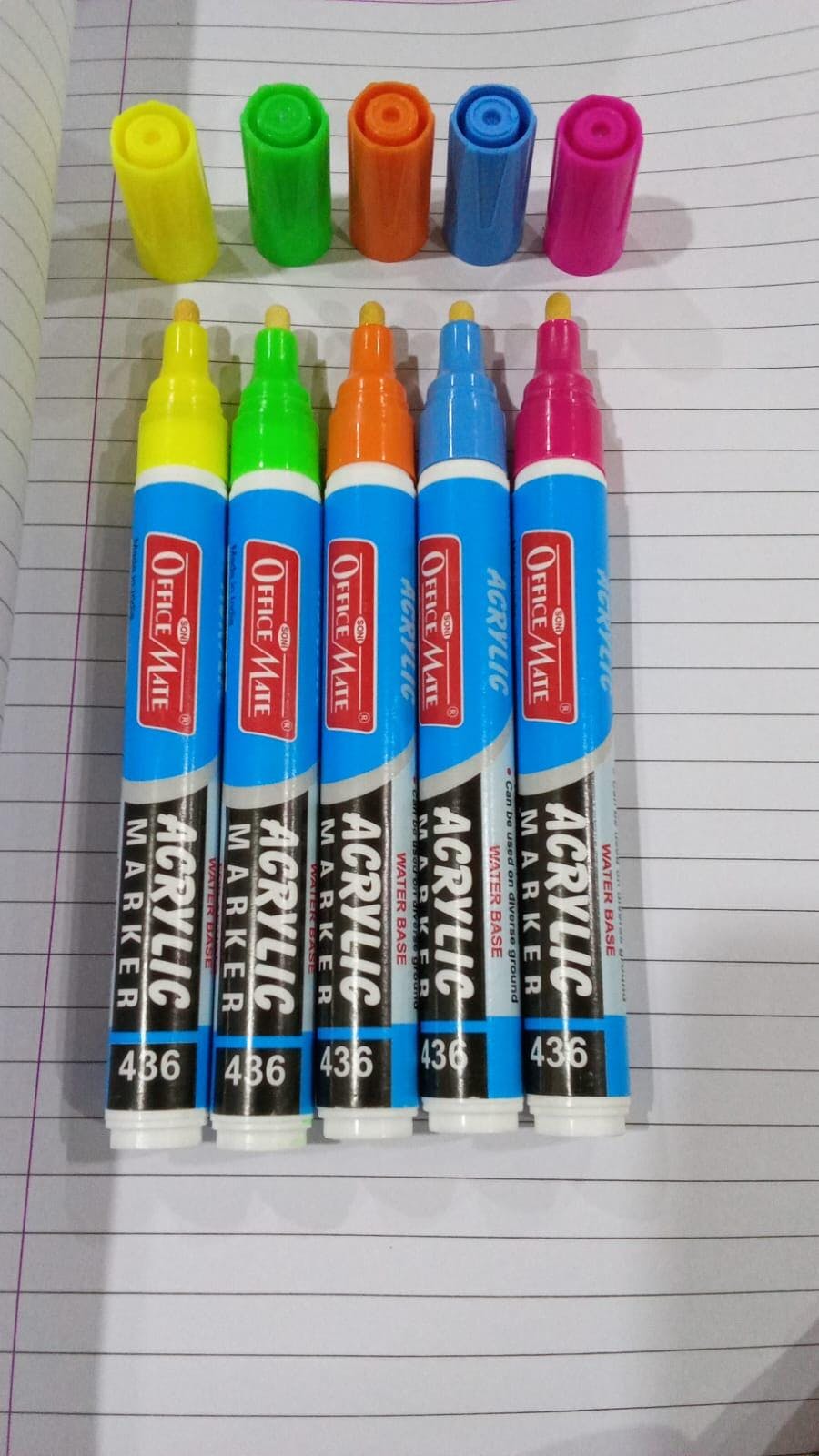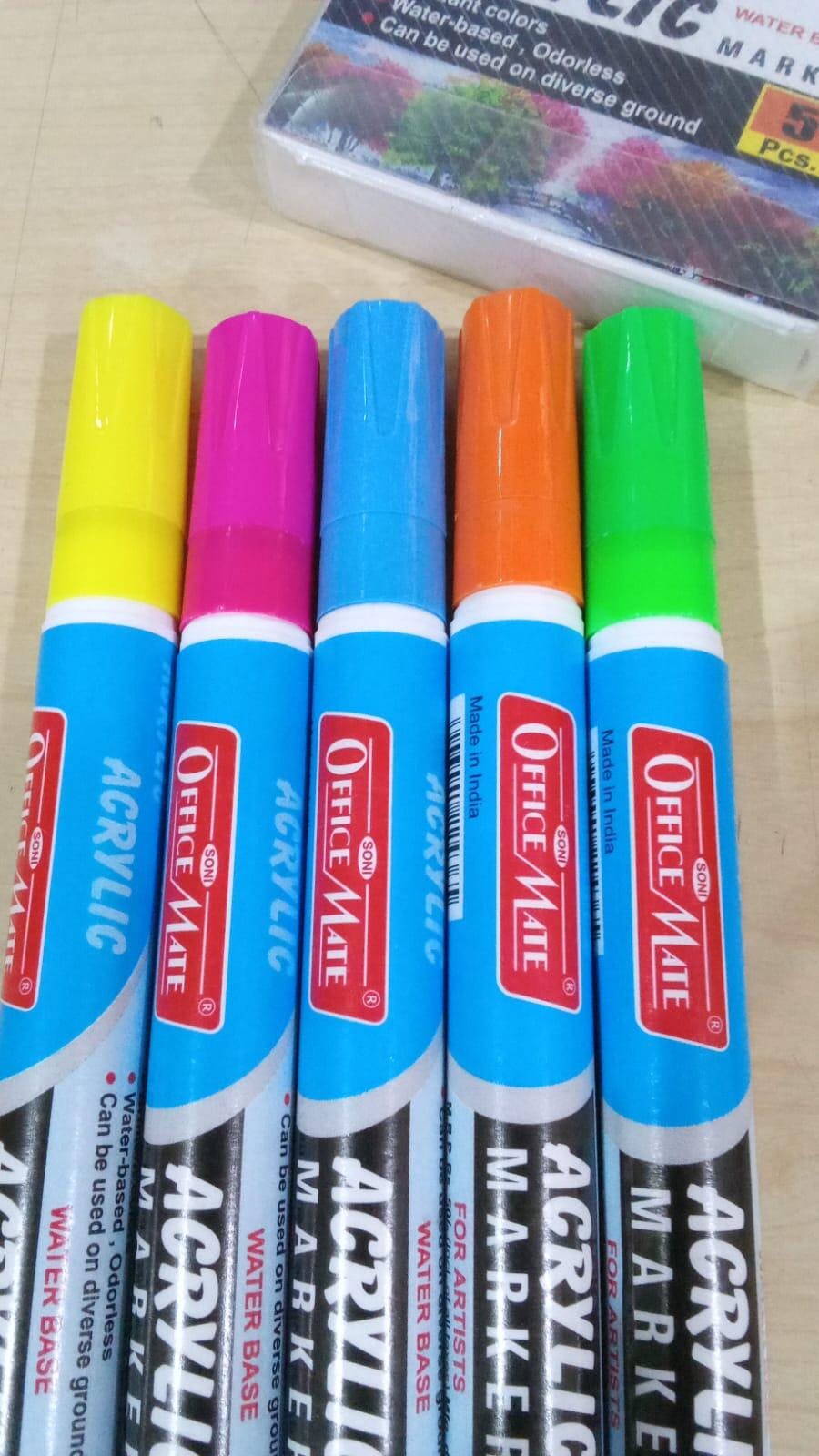 We have a large selection of fluorescent acrylic paint markers. They frequently come in packs of eight, twelve, or even twenty-four colours. Primary tones (black, white, red, blue, yellow, and green) are followed by secondary and tertiary hues (orange, purple, pink, light blue, lime, etc.). Additionally, some sets feature metallic hues like silver and gold. Every colour is vivid and opaque. You can even layer them because they're acrylic; after one colour dries, you can draw over it with another. Your projects can be very creative with this colour scheme.