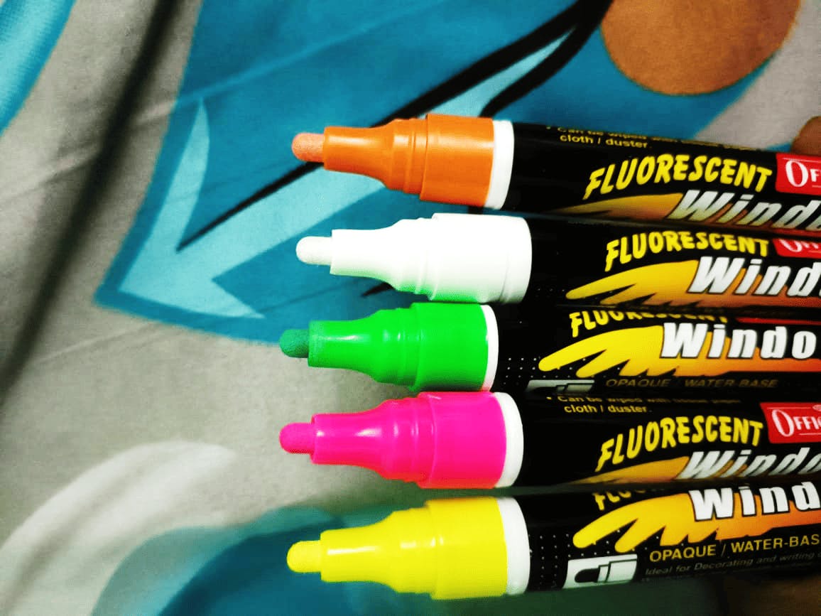 We offer window markers in a variety of vibrant, eye-catching colors that show up beautifully on glass surfaces. Popular shades include white (great for dark-tinted car windows), neon yellow, neon green, neon orange, red, blue, and pink. These fluorescent colors really pop, especially in sunlight, making your messages or designs stand out. Some sets also include black for outlining or adding contrast. All of our window marker colors are easy to wipe off and completely washable from glass. Using multiple colors makes your window art or signage even more attention-grabbing and fun!