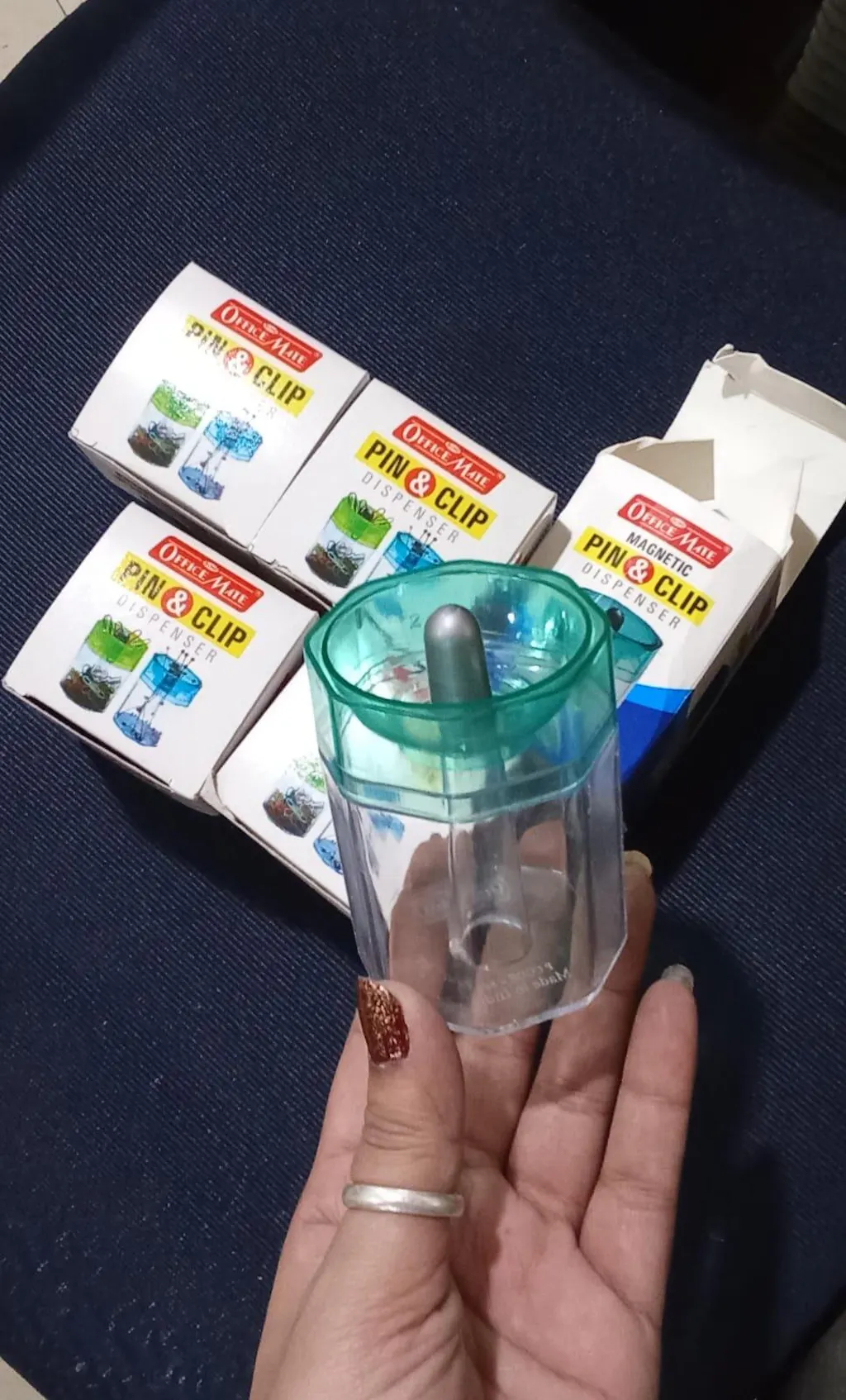 The magnetic pin and clip dispenser is made from a high-quality, durable plastic for the body and contains a strong internal magnet. The plastic gives it a sturdy yet lightweight frame, and the magnet is what holds the pins and clips. The overall design is sleek and meant to look neat on your desk, while the materials ensure it can handle daily use (the plastic won’t easily crack, and the magnet is rust-proof and long-lasting).