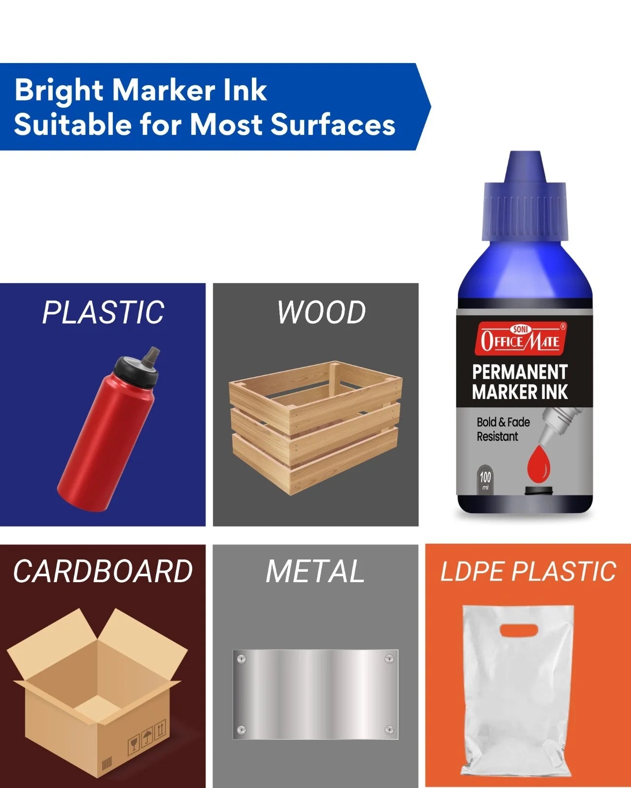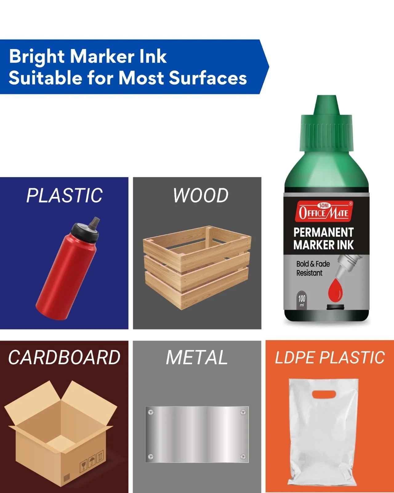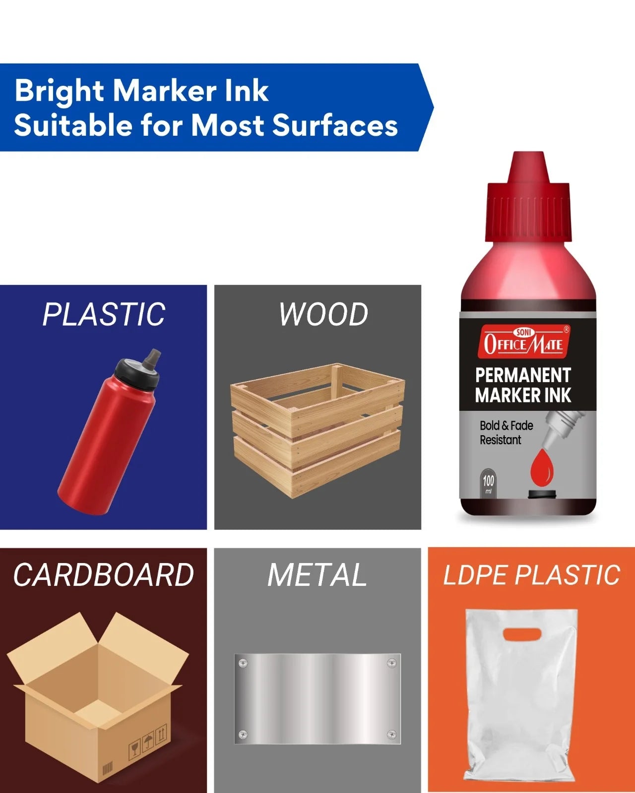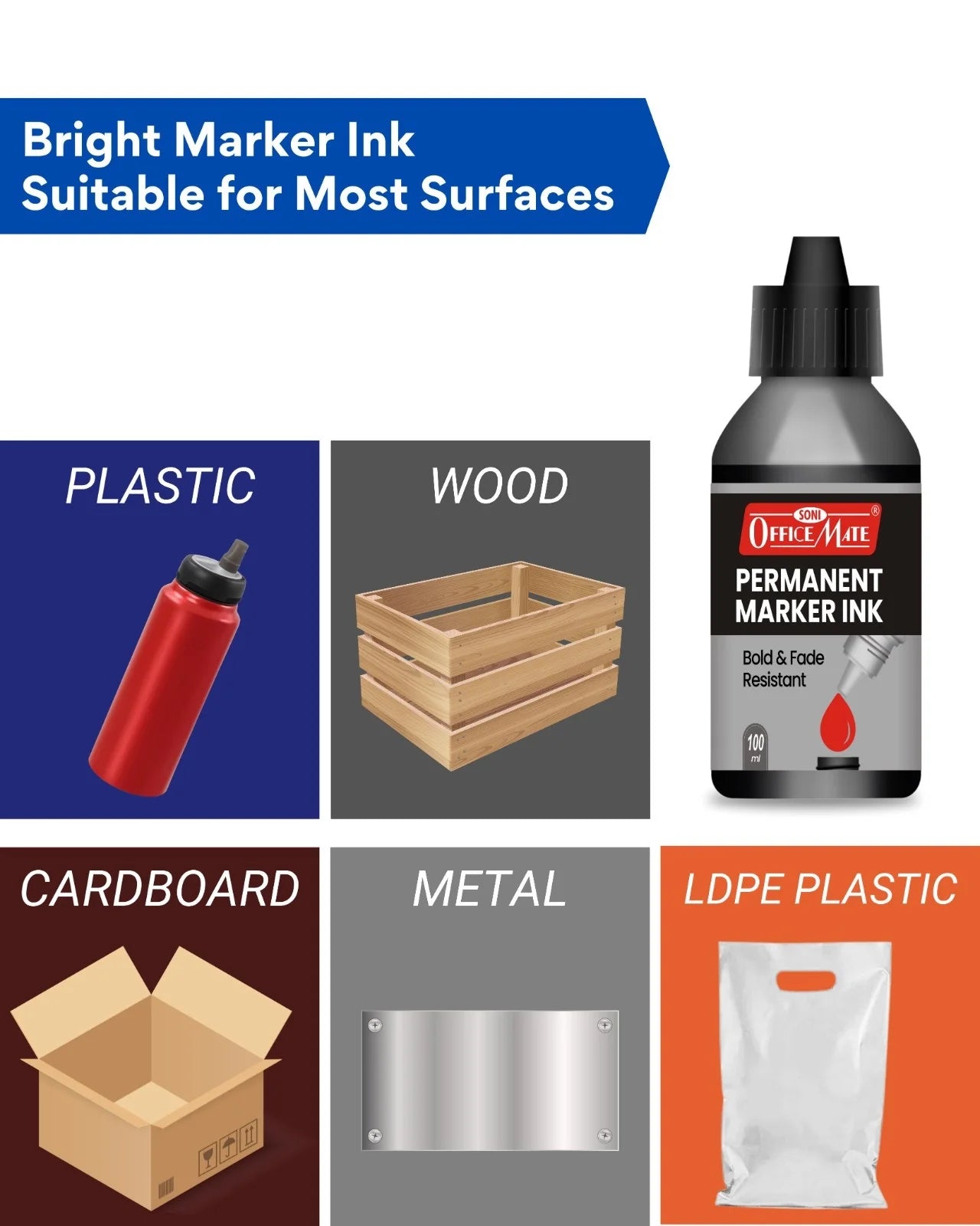 Our Soni Officemate refillable markers are compatible with our specially formulated permanent marker ink. We advise using our own markers for optimal performance, though it might work with other refillable markers, particularly those that use alcohol-based ink. Make sure the marker is made to be cleaned and refilled correctly if you decide to try it with a different brand. Although results may differ, Soni Officemate markers will give you the vibrant colour and seamless flow that they are designed for.