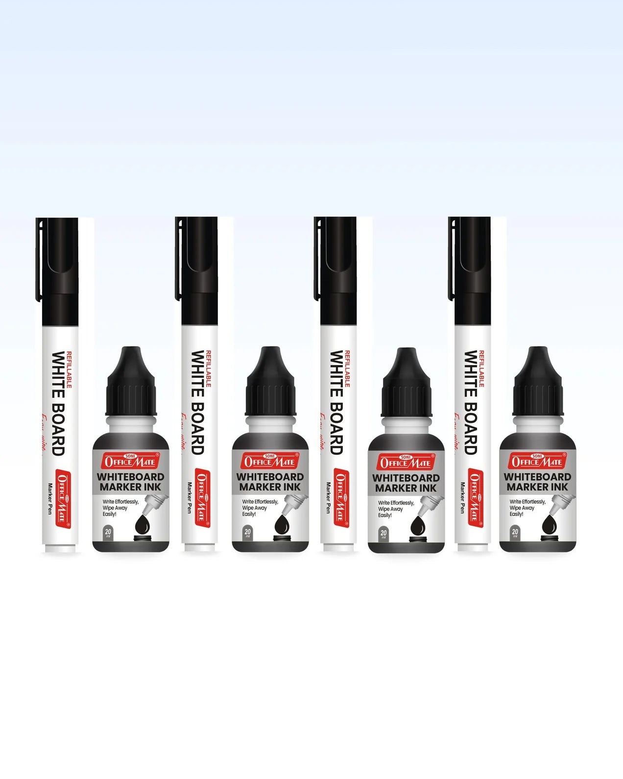 The Whiteboard Combo includes four whiteboard markers and four bottles of whiteboard ink. Typically, the markers are available in a variety of colours, including red, blue, green, and black. Every ink bottle has the same colour as a marker. Together with the ink to replace the markers when they run out, this set includes everything needed to write on whiteboards.